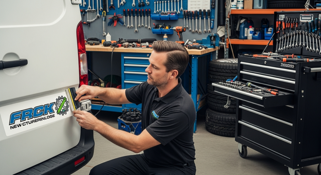 INSERT IMAGE HERE: Step-by-step photo sequence showing hands properly installing a bumper sticker, from surface cleaning through final smoothing, demonstrating professional technique