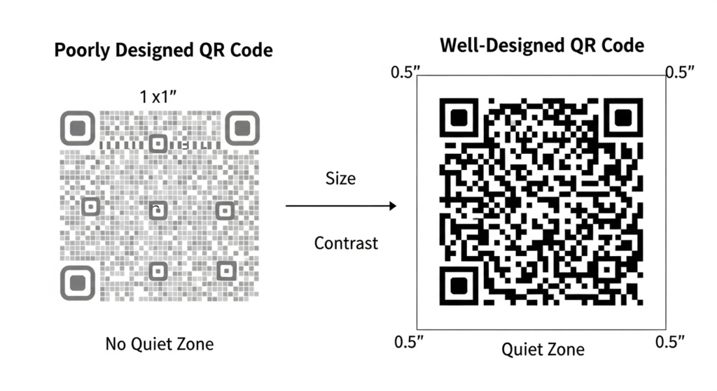 Busy visual environments like retail displays, trade show booths, and marketing materials require expanded quiet zones to separate QR codes from surrounding graphics, text, and images. A QR code surrounded by colorful promotional content needs more breathing room than one placed on a clean, minimal background.